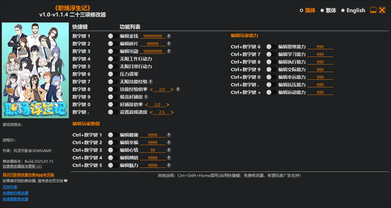 点击简体、繁体、English,可以切换语言 (切换语言后修改器将把该语言设置为默认语言)