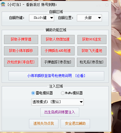 【辅助名称】:PC香肠派对_小绵羊火力过墙瞬击射速多功能辅助破解版