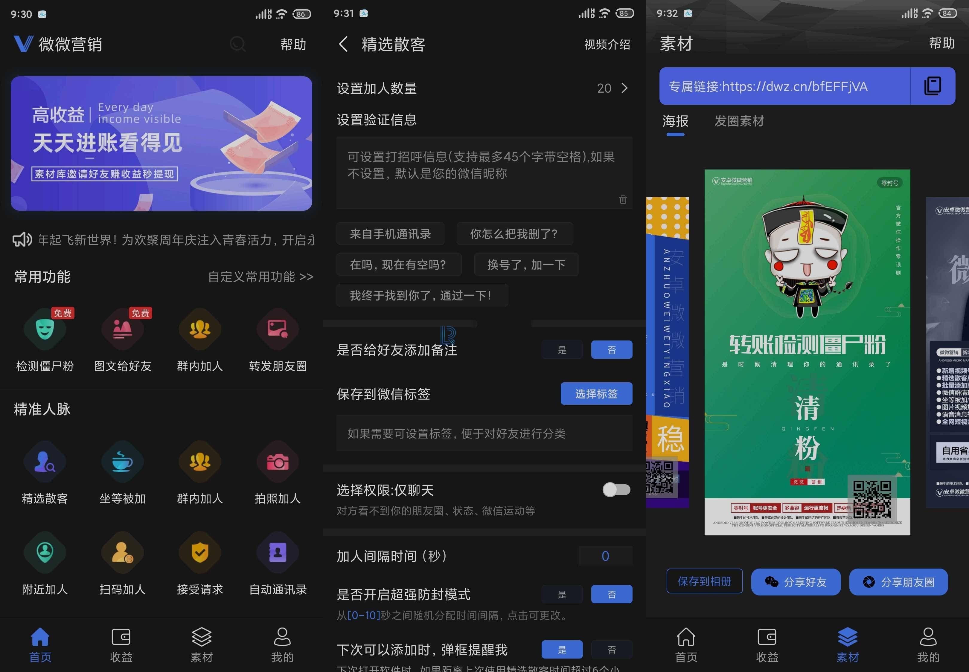 微微营销(包名:com.wsbaby.toolbox)是基于谷歌安卓系统官方功能开发,在微信服务基础上,帮助用户更便捷、快速地使用微信功能,为阅读内容、触屏操作、声音控制等方面给有困难的人群提供帮助,同时还具备视频 、图片添加水印功能,使用时请严格遵守微信官方使用规范。